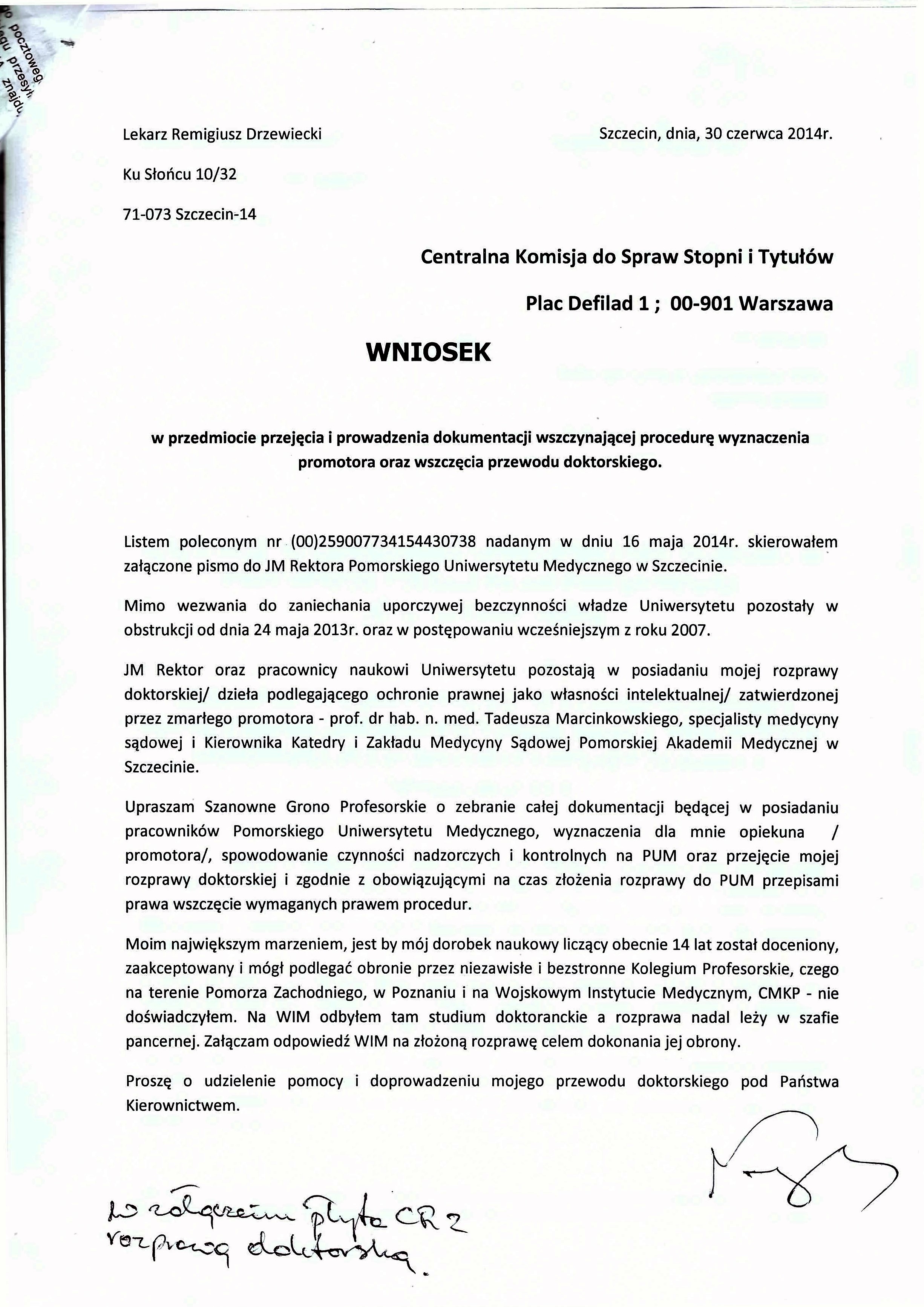 Centralna Komisja do spraw stopni i Tytułów wniosek o wyznaczenie promotora rozprawy doktorskiej