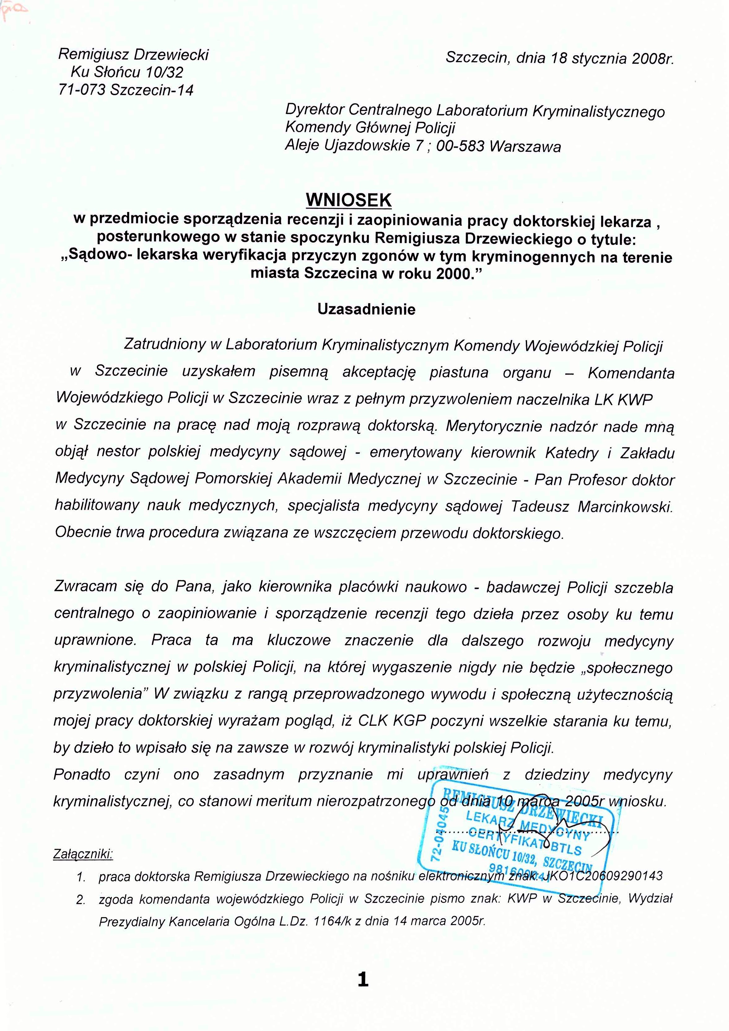 Dyrektor CLK KGP wniosek o pomoc w sporządzeniu recenzji i zakończeniu rozprawy doktorskiej posterunkowego lekarza Remigiusza Drzewieckiego