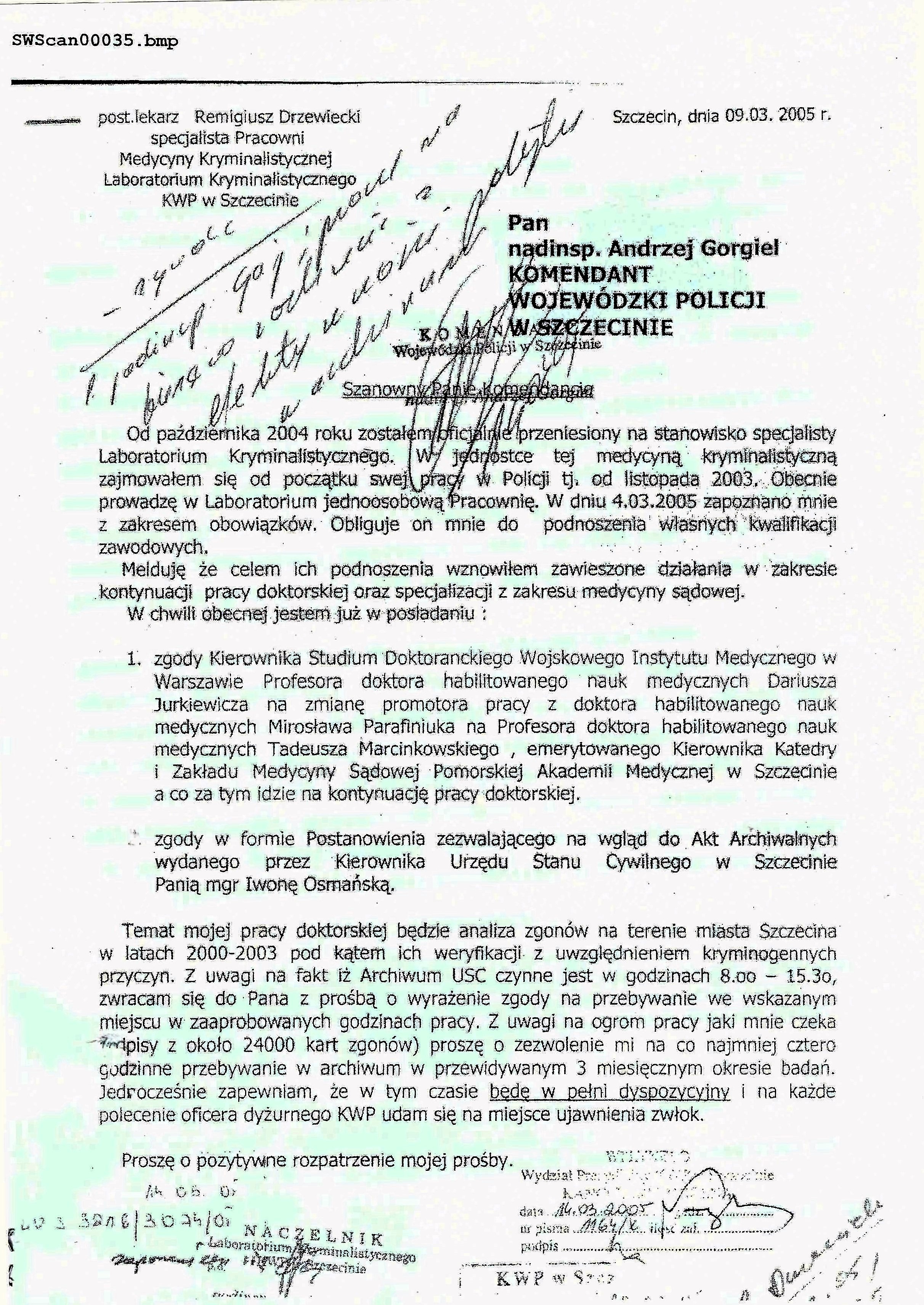 Komendant Wojewódzki Policji w Szczecinie - zgoda pracodawcy na prowadzenie rozprawy doktorskiej w dziedzinie medycyny sądowej