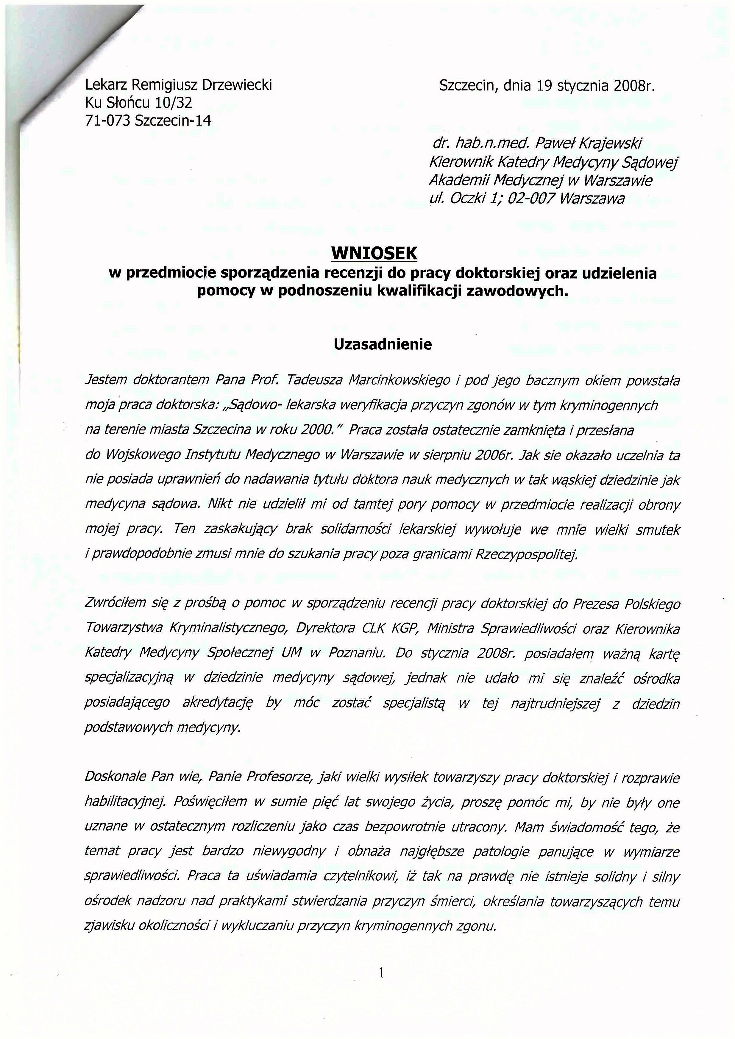 Medycyna Sądowa w WUM - wniosek o pomoc - bez odpowiedzi prof Krajewskiego A