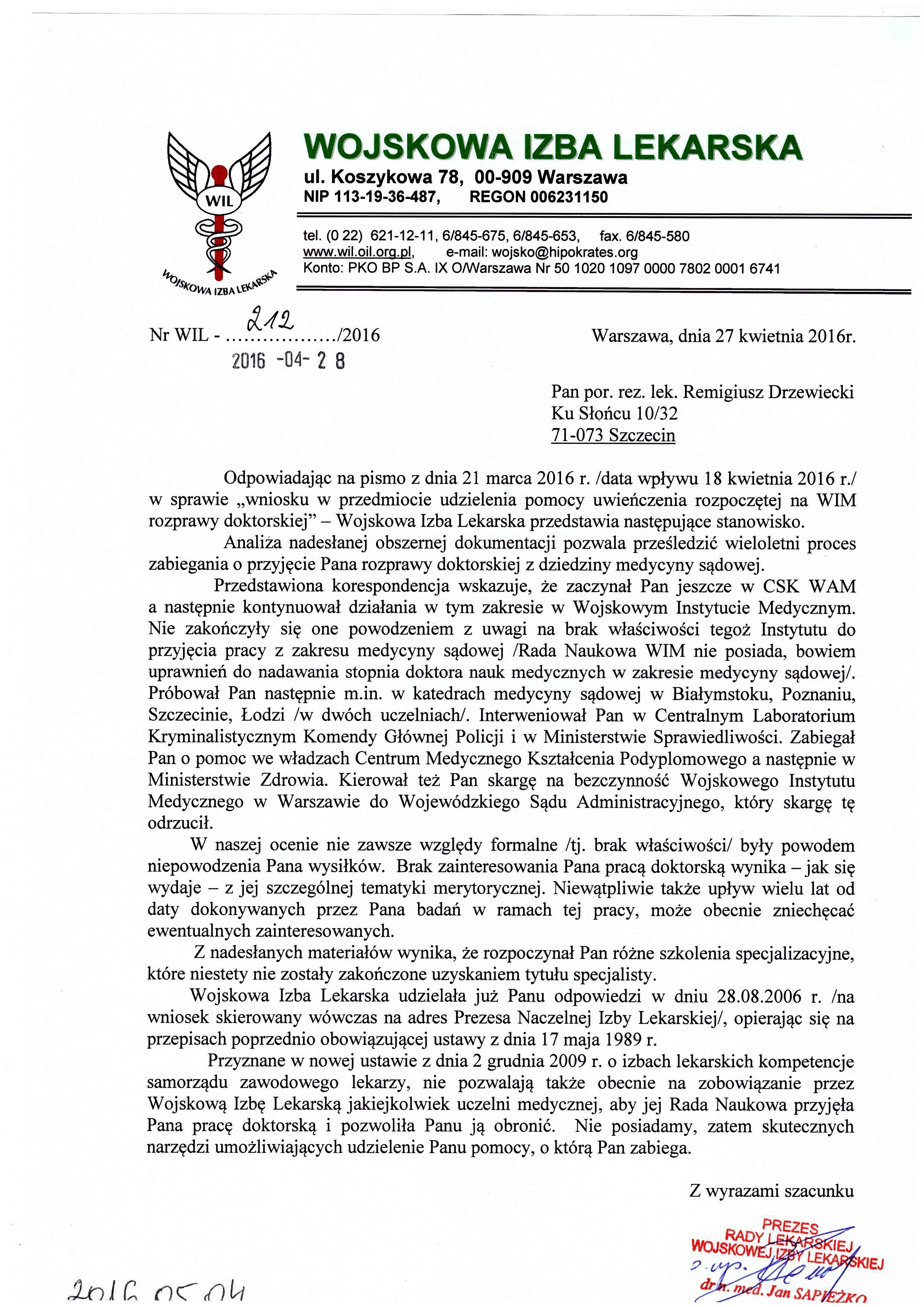 odpowiedź Prezesa Wojskowej Izby Lekarskiej na wniosek o pomoc w rozprawie doktorskiej - 28 kwiecień 2016