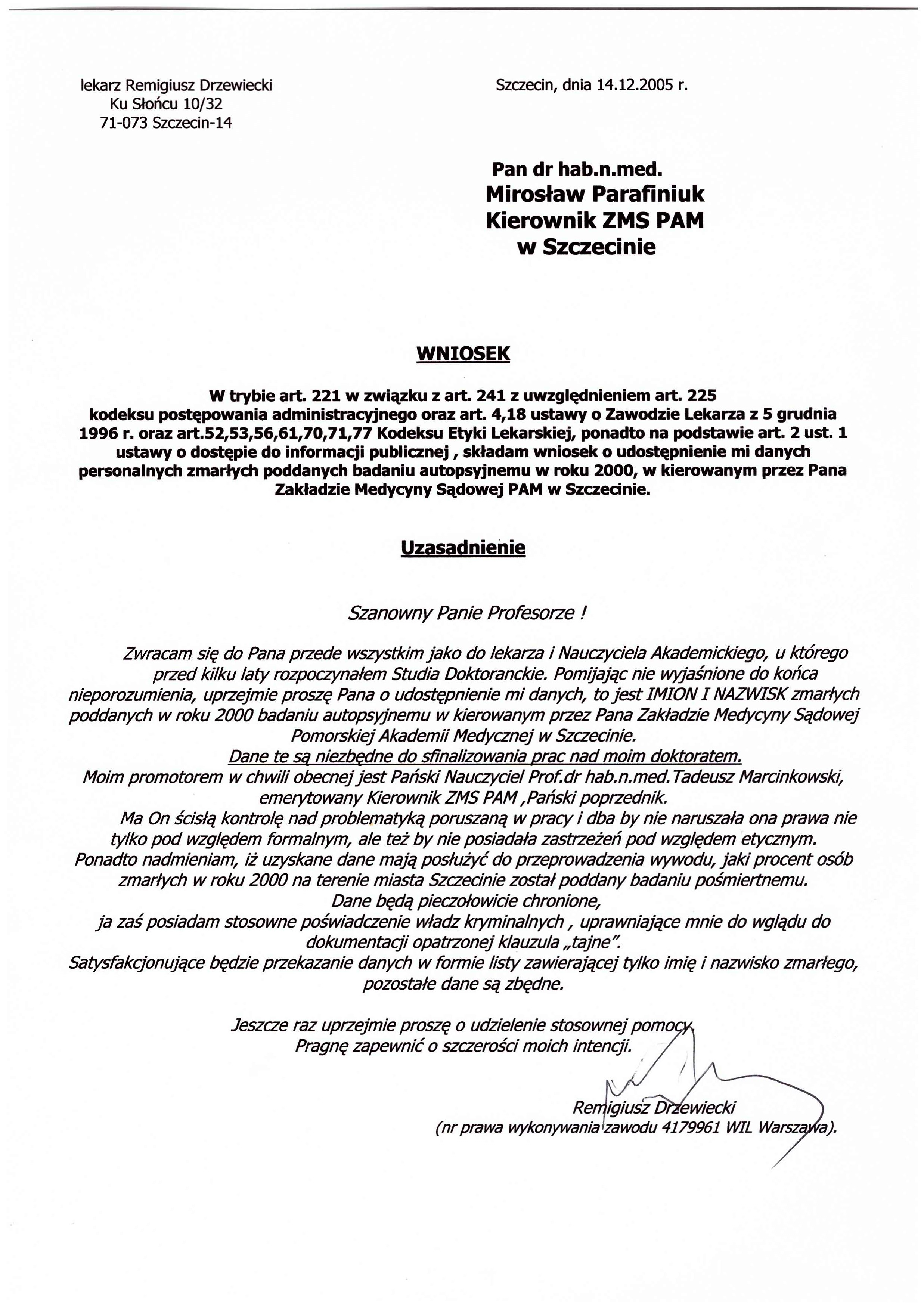 Parafiniuk - były promotor, - wniosek o udostępnienie materiału do pracy doktorskiej