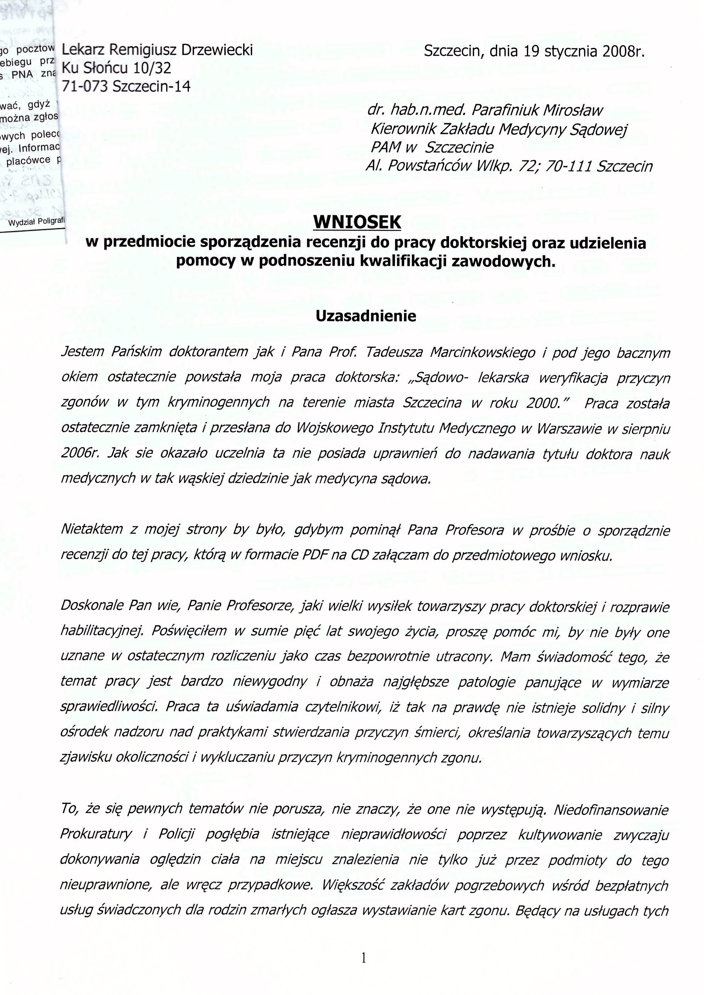 Parafiniuk, wniosek o pomoc zw zakończeniu rozprawy doktorskiej oraz o wystawienie recenzji cz A