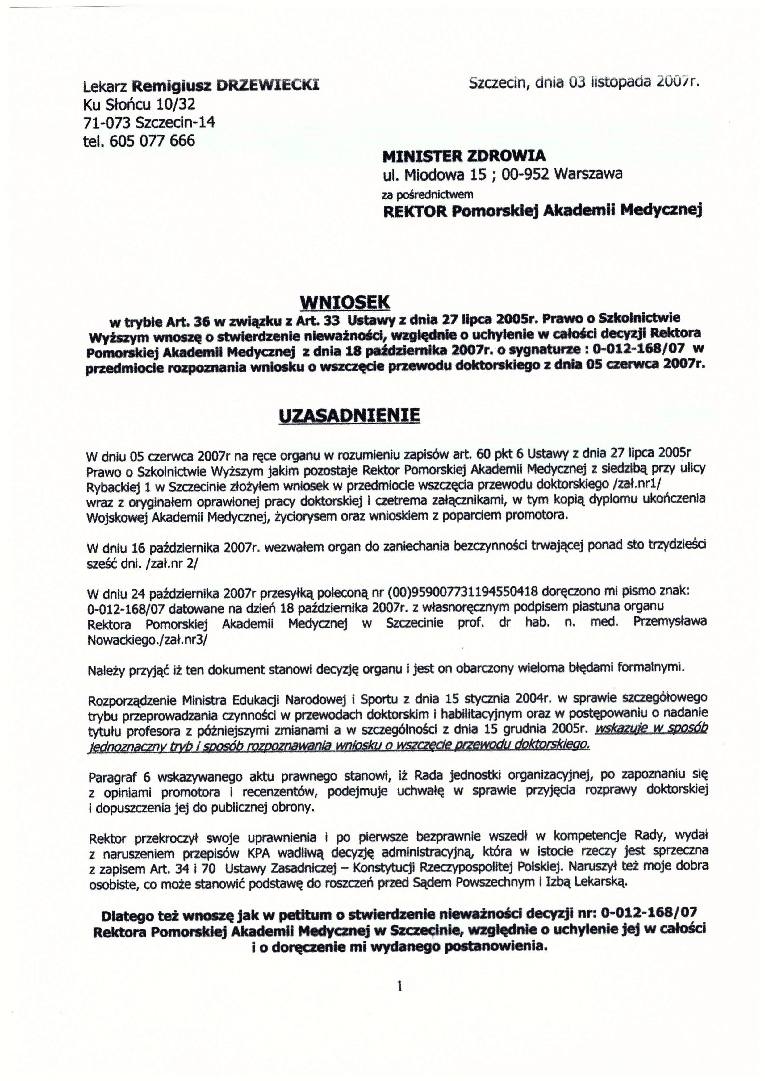 Wniosek do Ministra Zdrowia w przedmiocie nakazania Rektorowi PUM wydania decyzji administracyjnych w sprawie mojej rozprawy doktorskiej i stosowania się do zasad