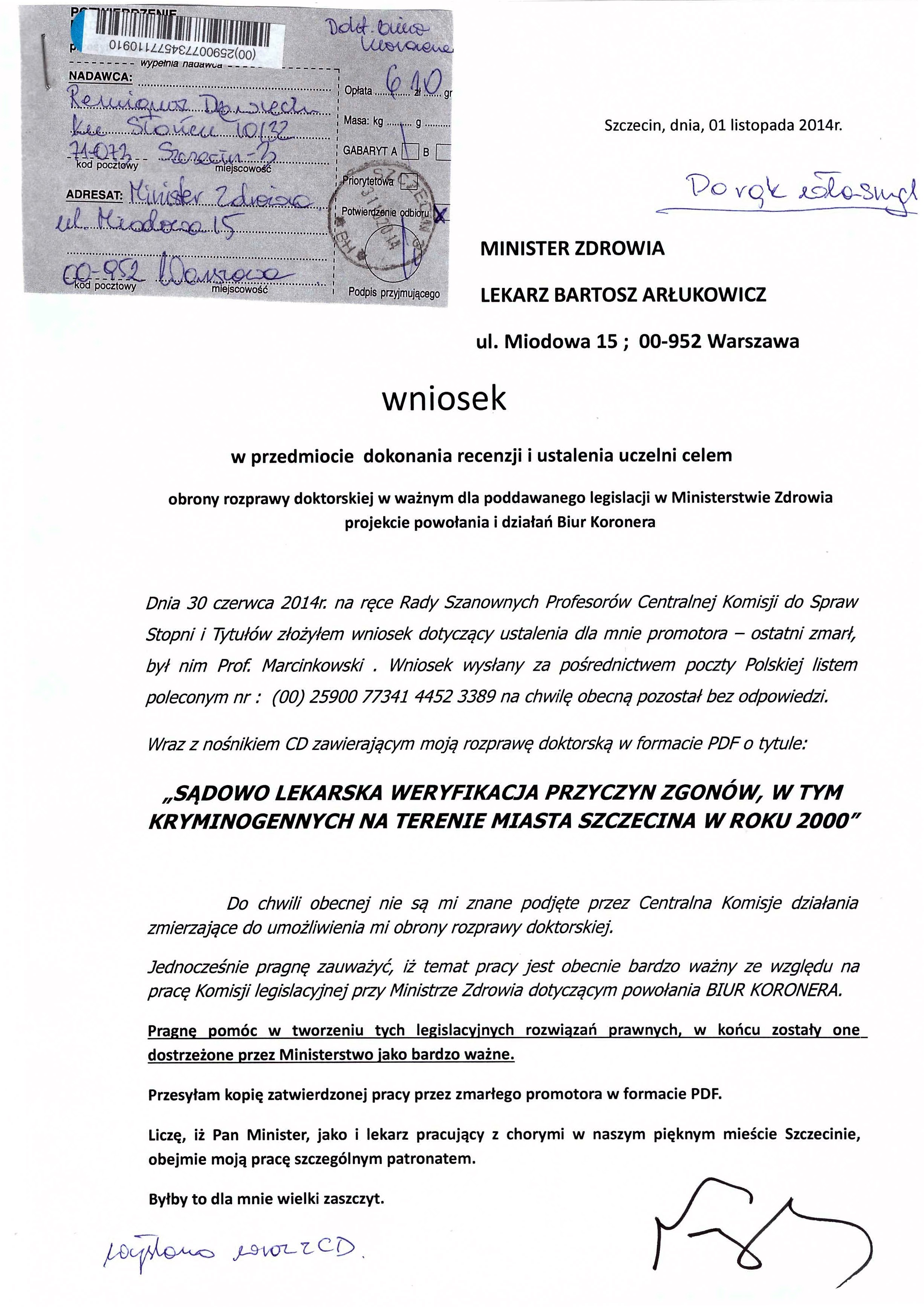 Wniosek o pomoc w rozprawie doktorskiej kierowany do Ministra Zdrowia - Batrosza Arłukowicza